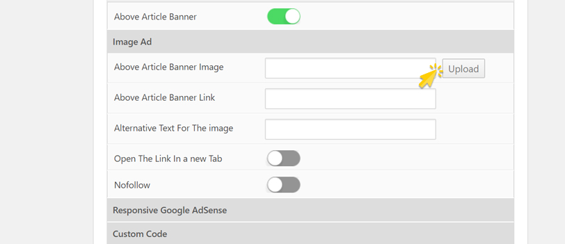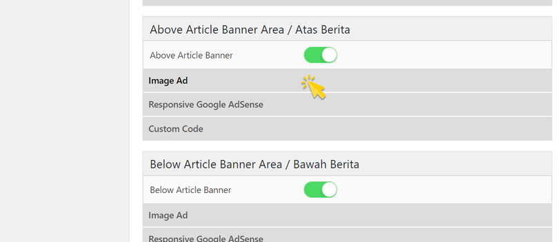 Pada kolom Above Article Banner Area / Atas Berita (kanan) klik Image Ad