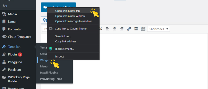 Pada halaman yang sama arahkan pointer mouse pada menu Tampilan lalu klik Kanan pada menu Widget, dan klik Open link in new tab, halaman pengaturan Widget akan terbuka pada tab baru browser Anda