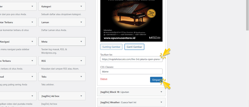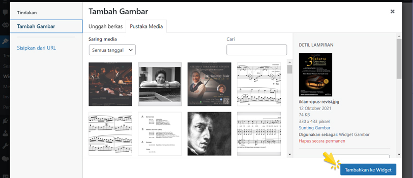 Pilih gambar iklan yang sebelumnya sudah diunggah pada artikel iklan, lalu klik tombol Tambahkan ke Widget