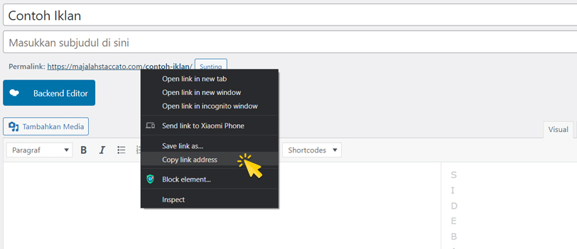 Kembali pada tab tambah artikel iklan yang sebelumnya untuk copy link artikel, klik kanan kada Permalink lalu klik Copy link address