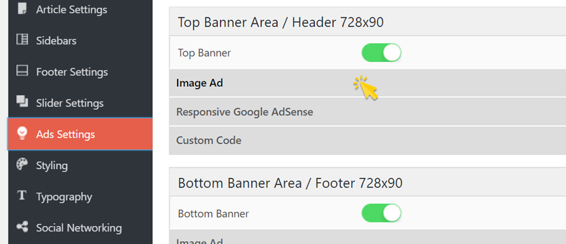 Pada kolom Top Banner Area / Header 728×90 (kanan) klik Image Ad