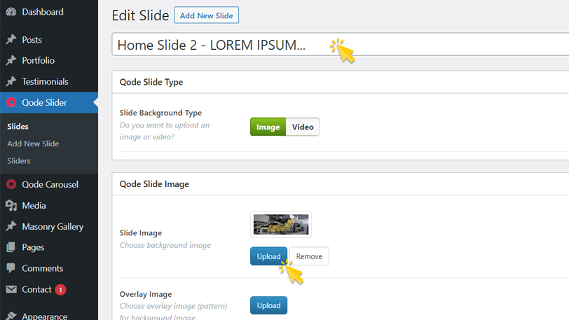 Ubah nama slider, kemudian klik tombol Upload pada Slide image untuk mengganti gambar/foto slider