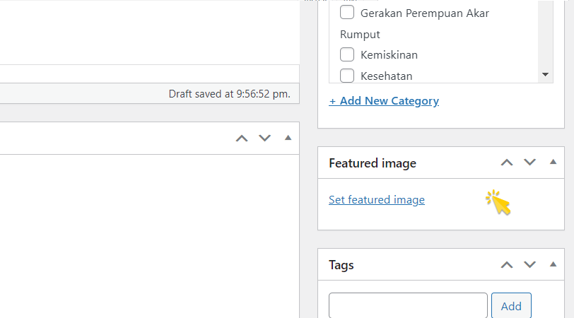 Upload gambar/foto berita pada kolom berikut ini, klik Set featured image untuk menampilkan jendela upload gambar/foto