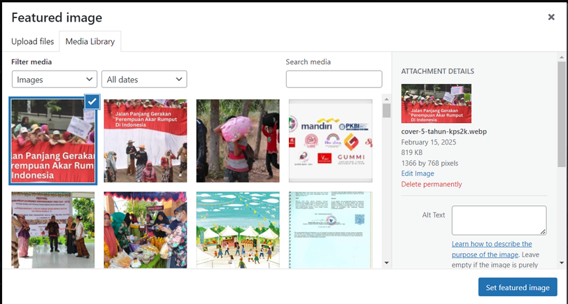 Tunggu beberapa saat hingga proses upload selesai, kemudian klikĀ Set featured image