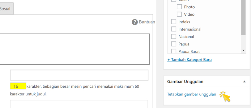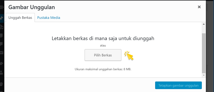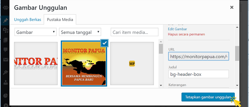 Upload gambar/foto berita pada kolom berikut ini, klik Tetapkan gambar unggulan untuk menampilkan jendela upload gambar/foto